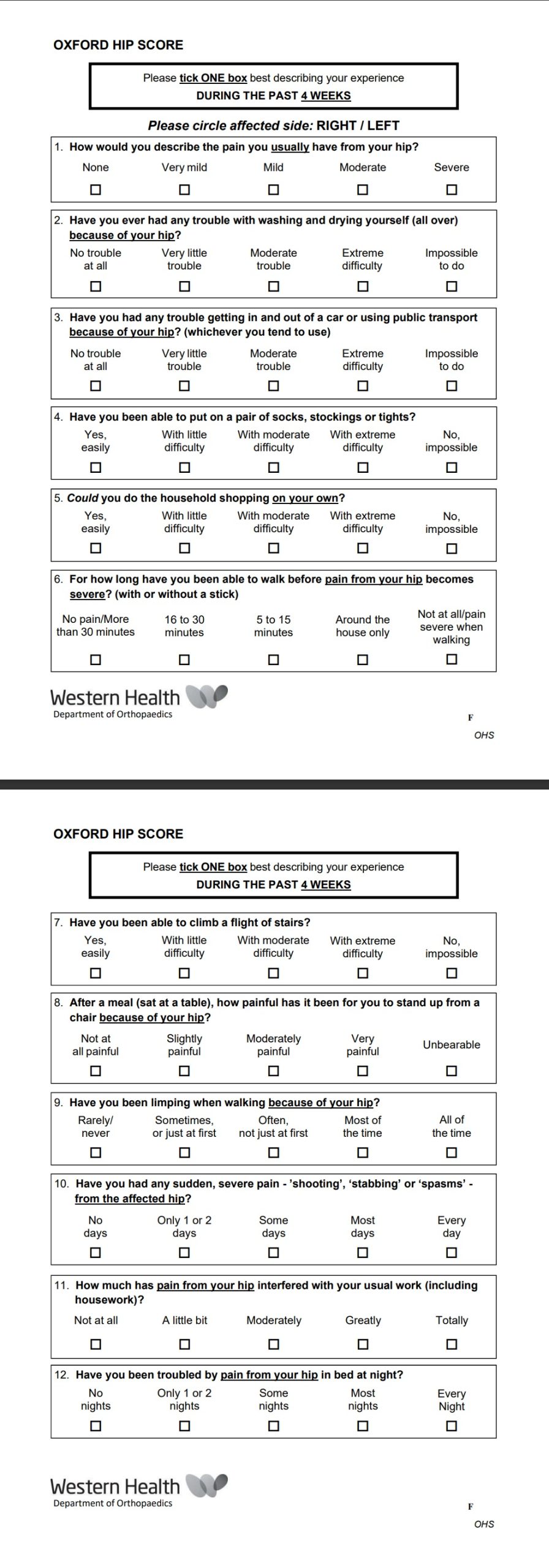 • Patients complete surveys (Oxford Hip Score, Oxford Knee Score) and tell us if they have issues related to the operated joint.