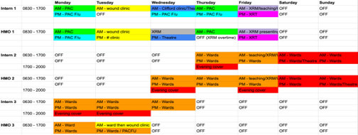 | Outpatient Clinic | Tuesday – AM Wound Clinic (HMO/intern) – PM Fracture Clinic (HMO) Friday – AM Consultant Clinic (HMO/intern) – AM Registrar Clinic (HMO/intern) runs concurrently with consultant clinic |